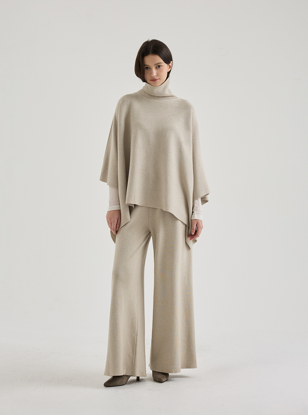 하이넥 탑과 와이드 팬츠로 구성된 케이프 니트 셋업은