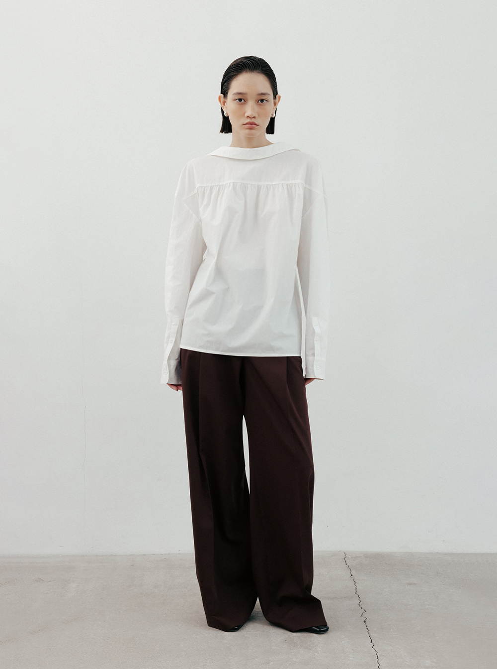 프런트 셔링 디테일과 드롭 소매로 페미닌한 무드를 더하고,