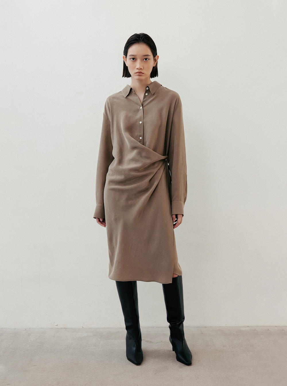 스트레이트 카라와 힙 라인의 비대칭 버튼 플래킷이