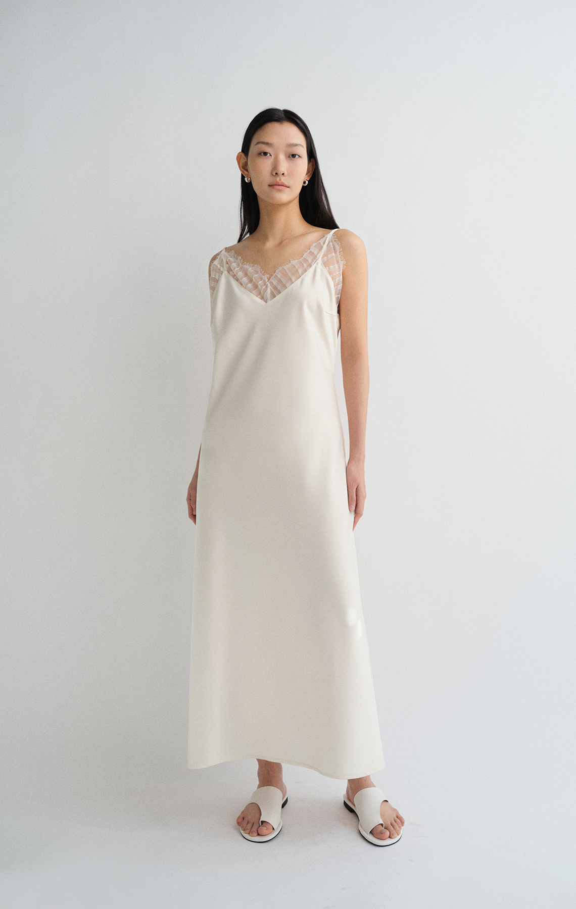 바이어스 결로 재단되어 유연하게 흐르는 실루엣에