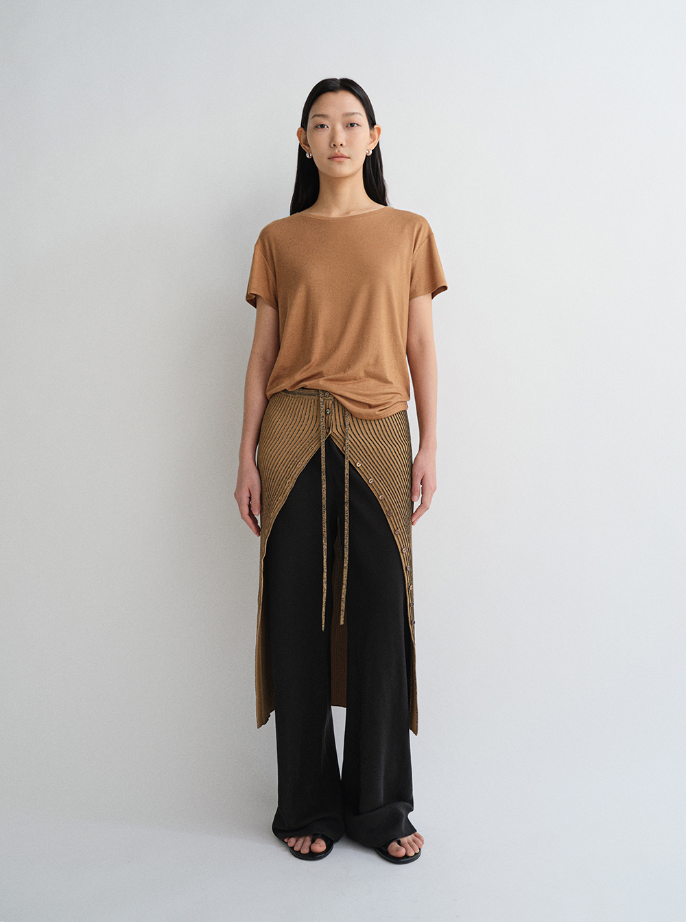 레이온과 메탈사 혼용 원사의 은은한 광택감이 돋보이는 니트 스커트로,