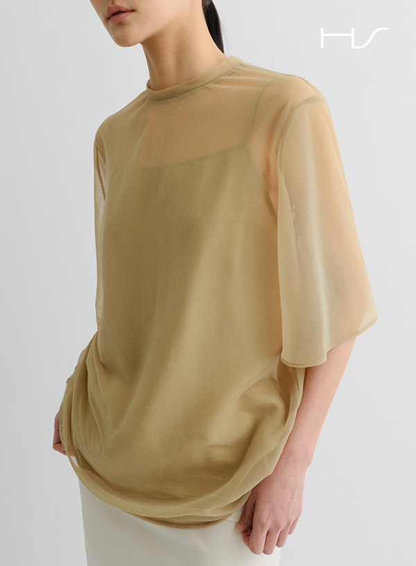 시어 원단으로 제작된 라운드넥 반팔 블라우스입니다.