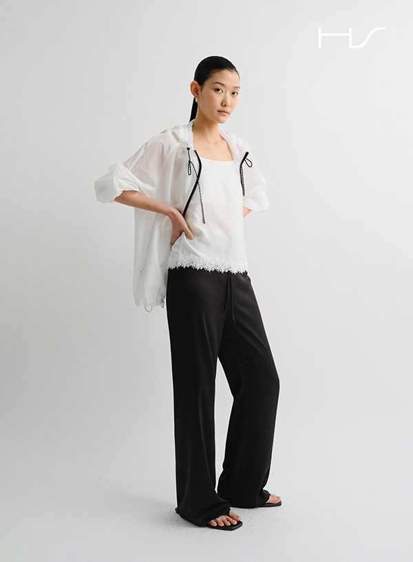 앞 스트링과 뒤 밴딩 디테일로 편안한 착용감을 제공합니다.
