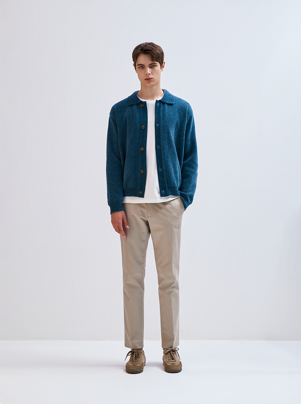 부드럽고 포근한 촉감이 매력적인 셔닐 소재의 카라 가디건입니다.
