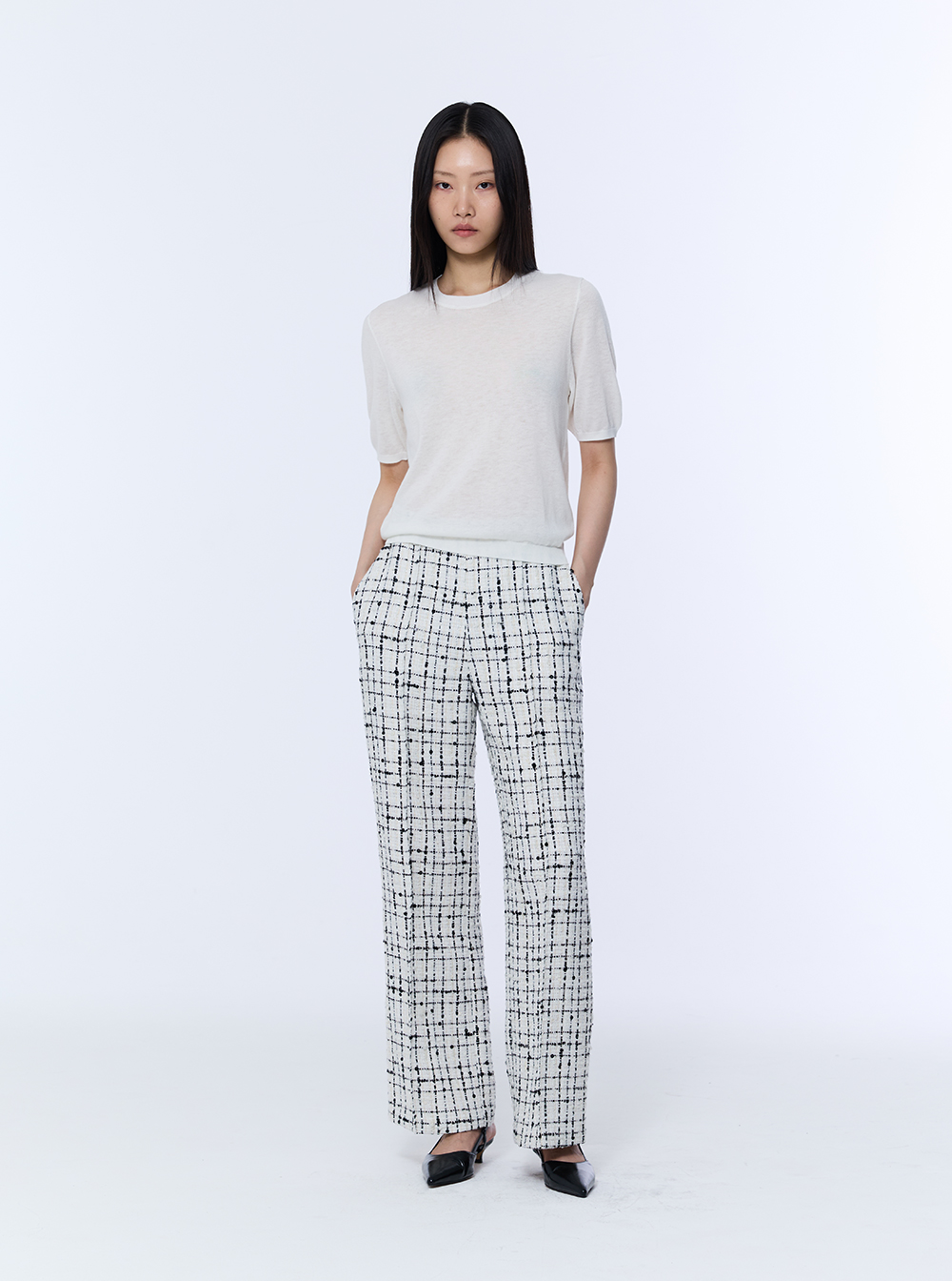 견고하고 섬세한 원사를 엮은 트위드 소재로