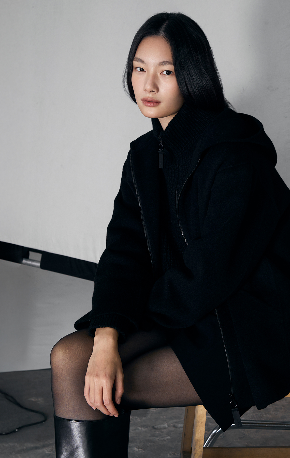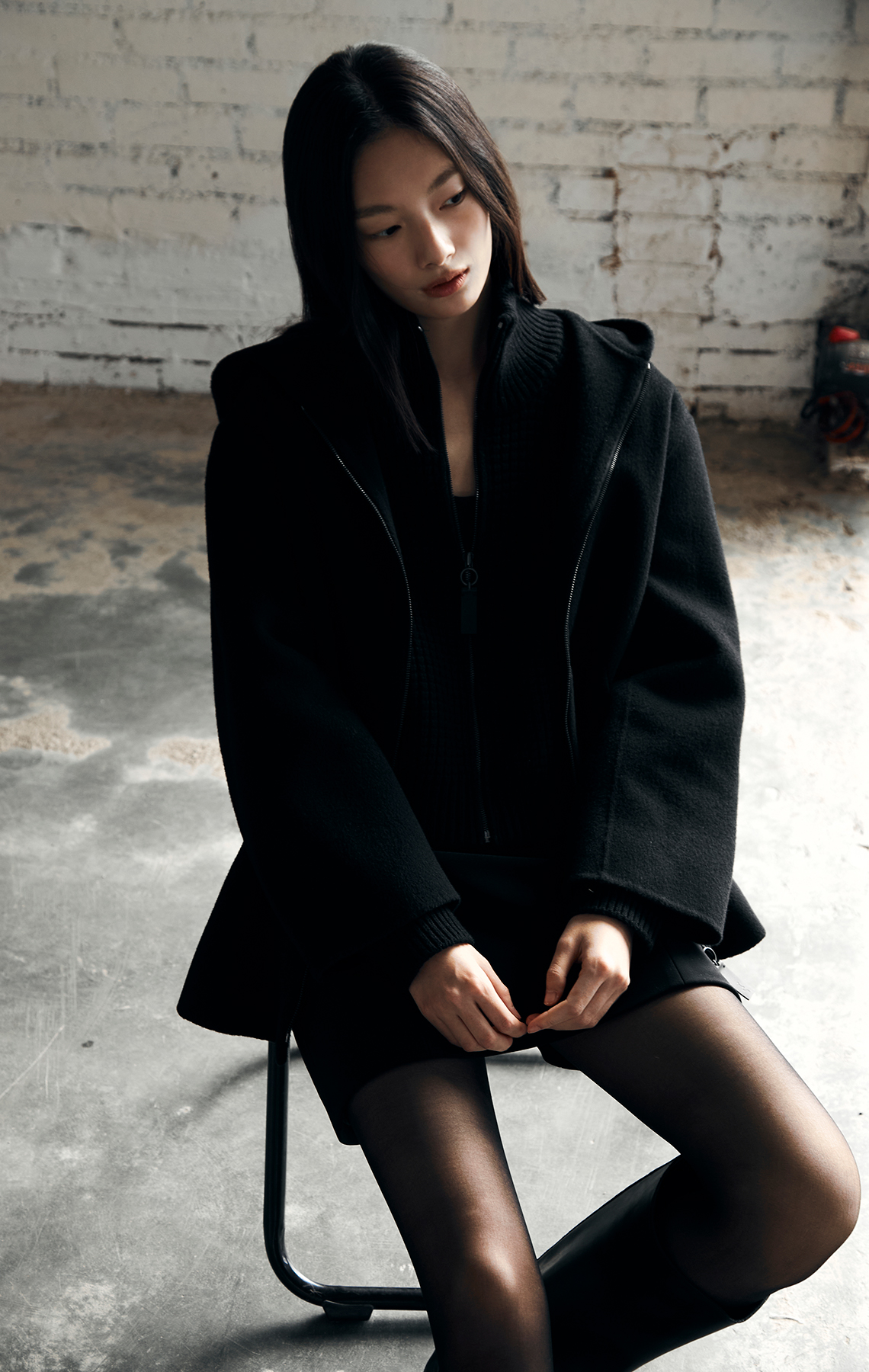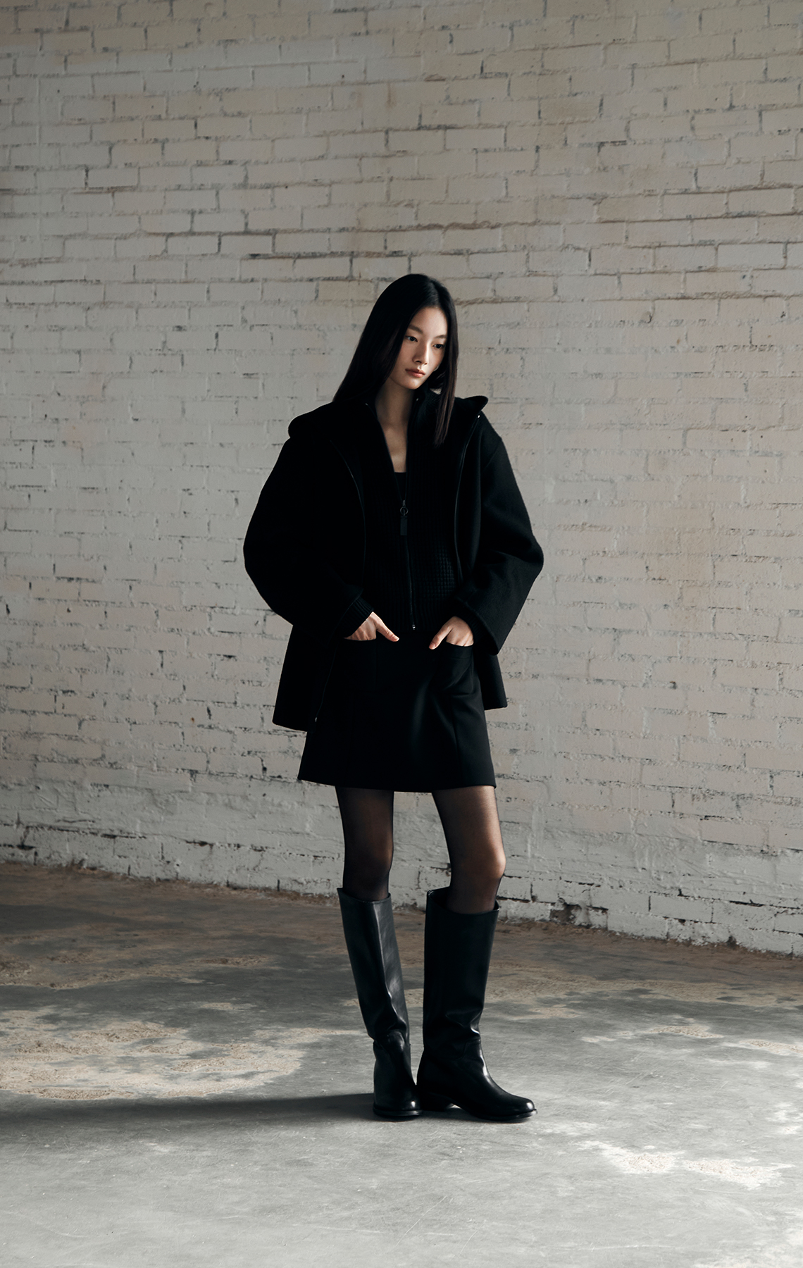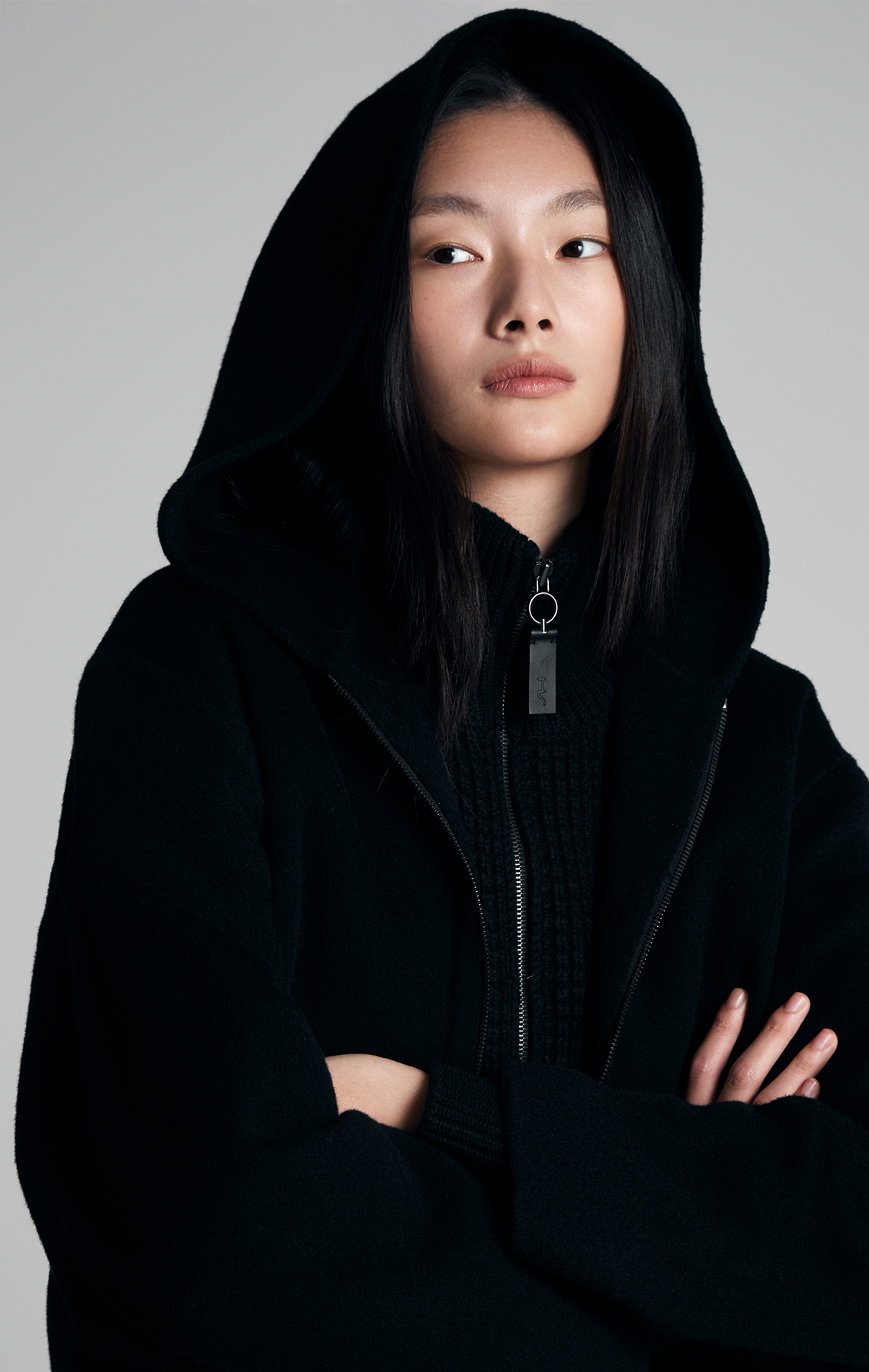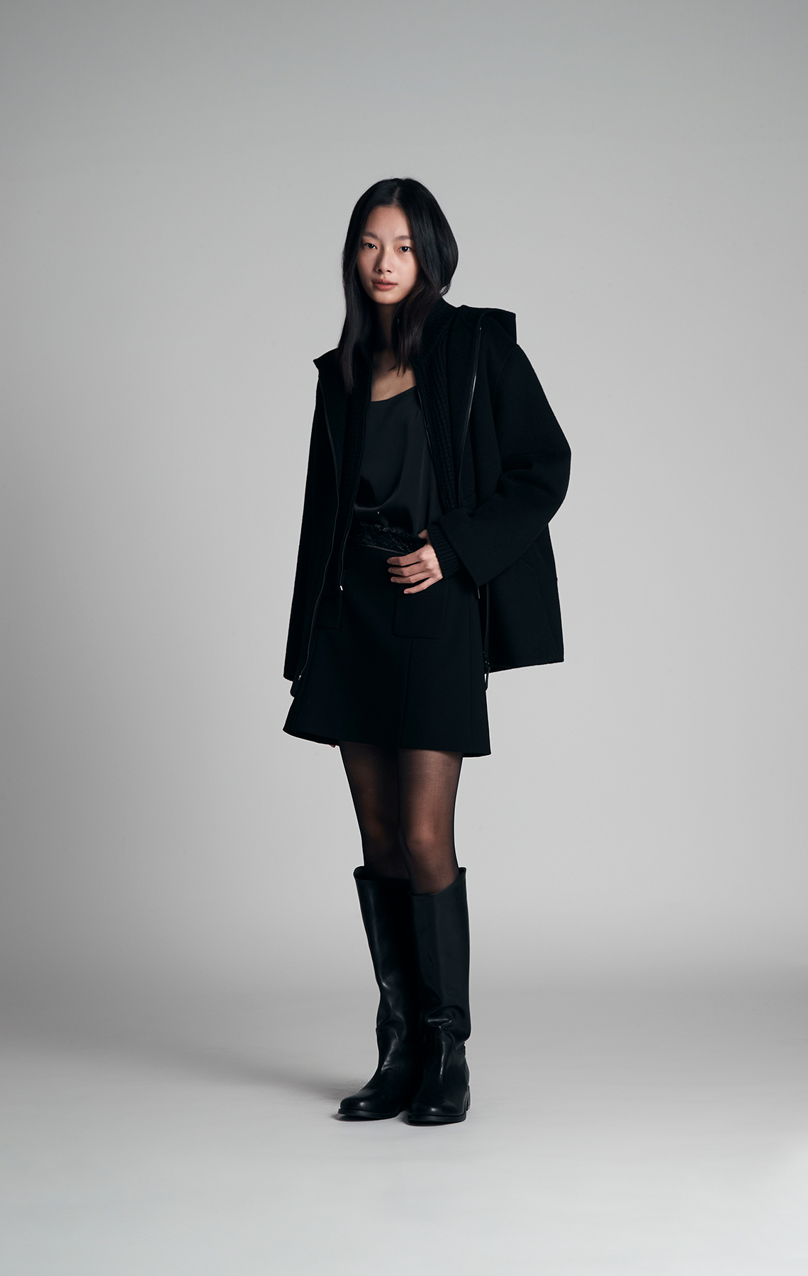 하이넥 디자인과 크롭 기장이 세련된 실루엣을 연출하고,