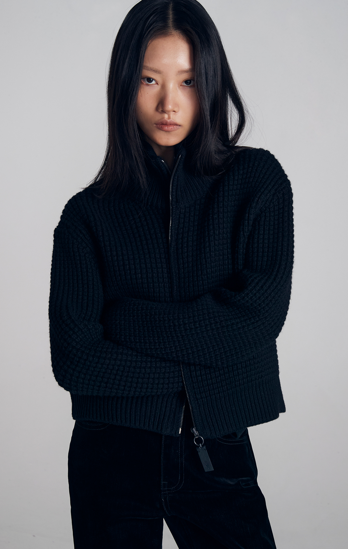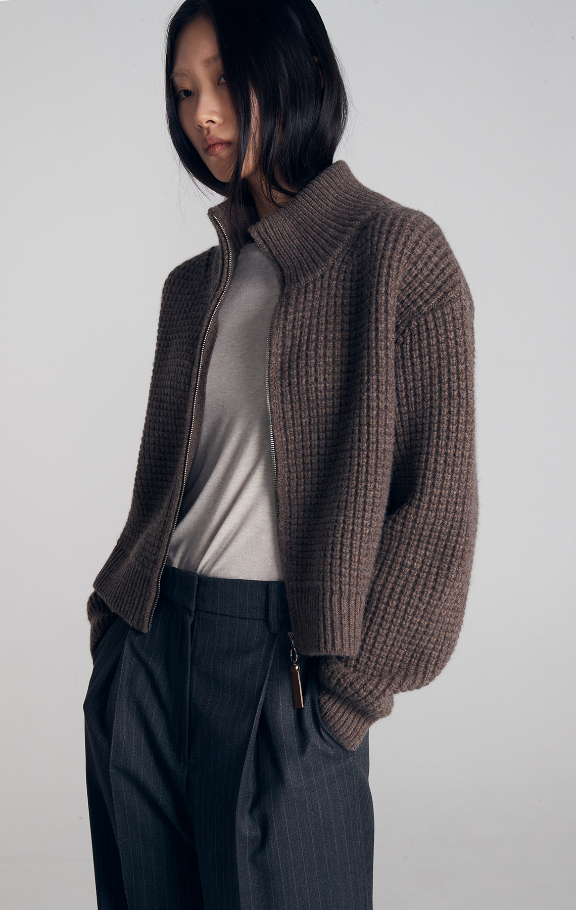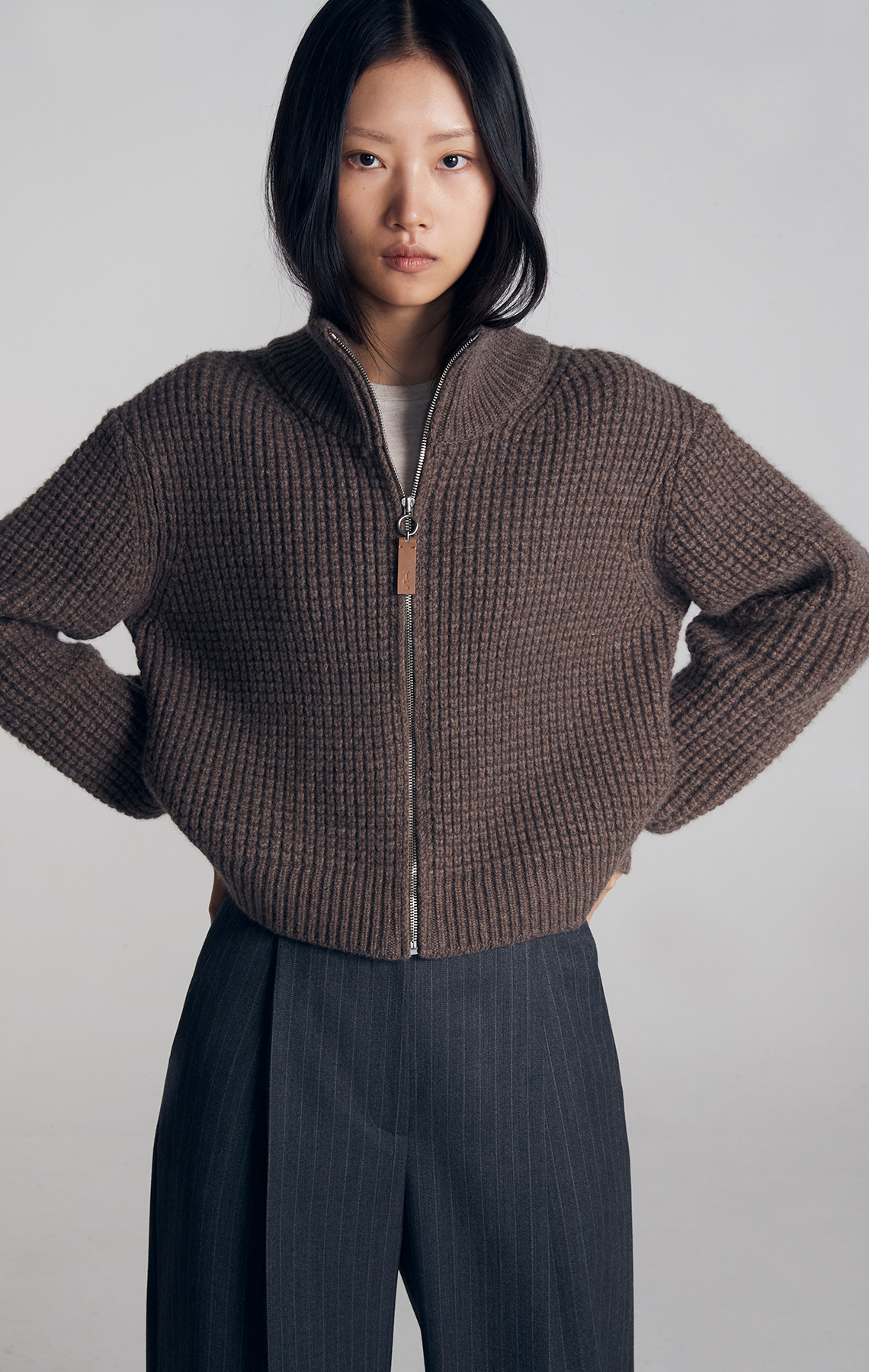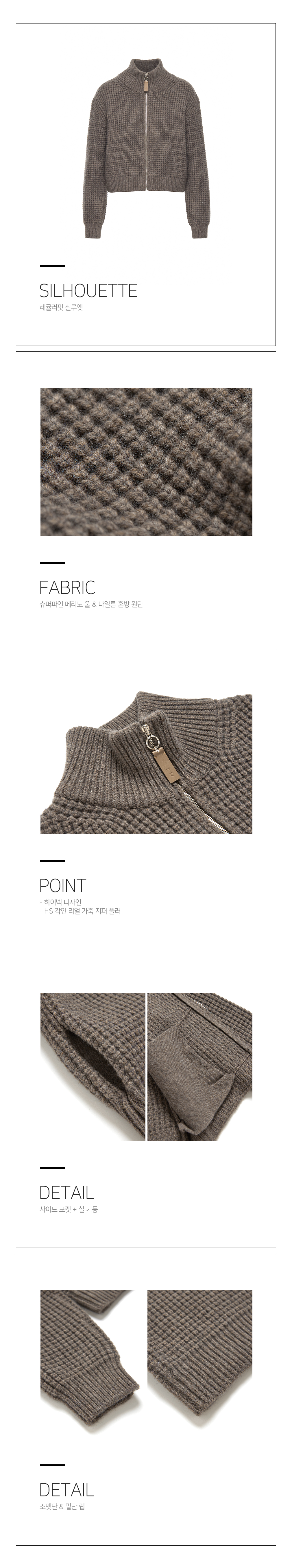 고급 슈퍼파인 메리노 울 소재의 와플 조직 니트 집업입니다.
