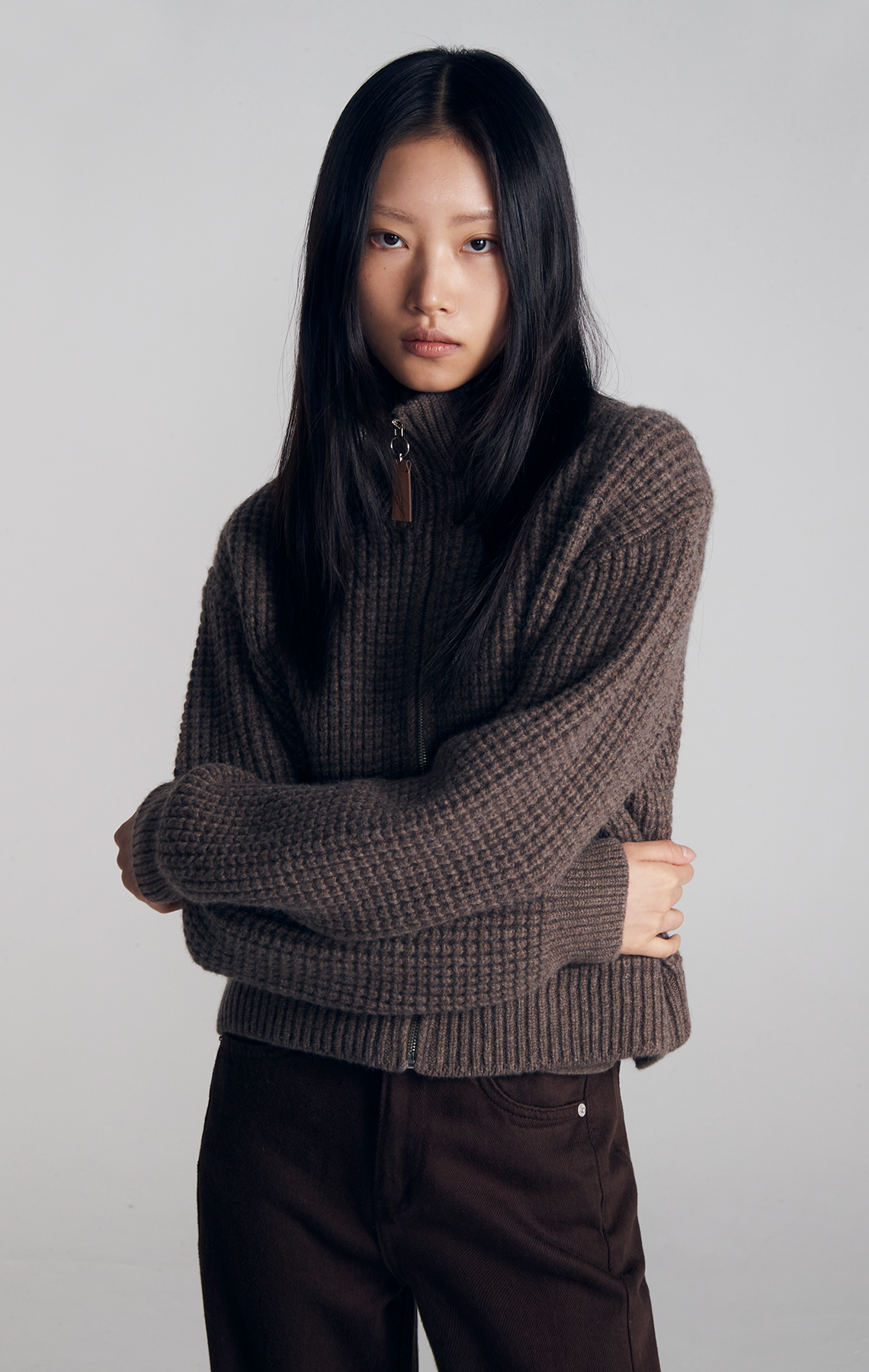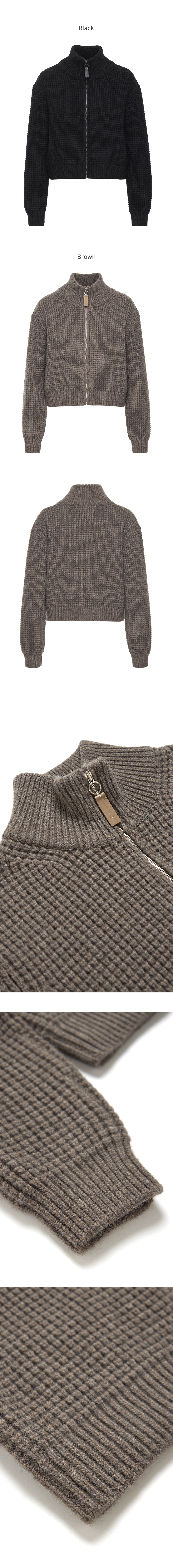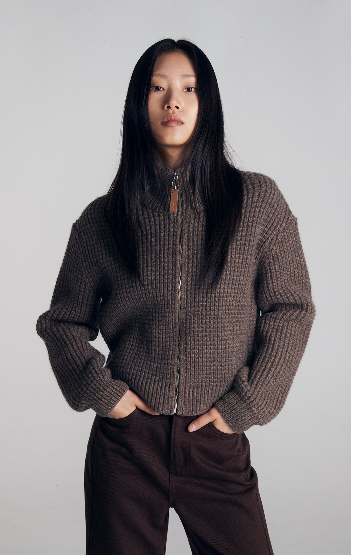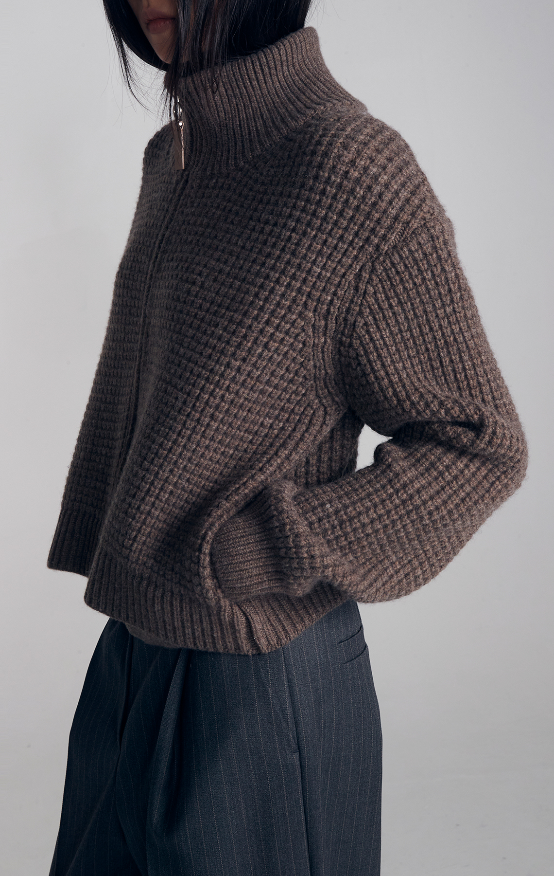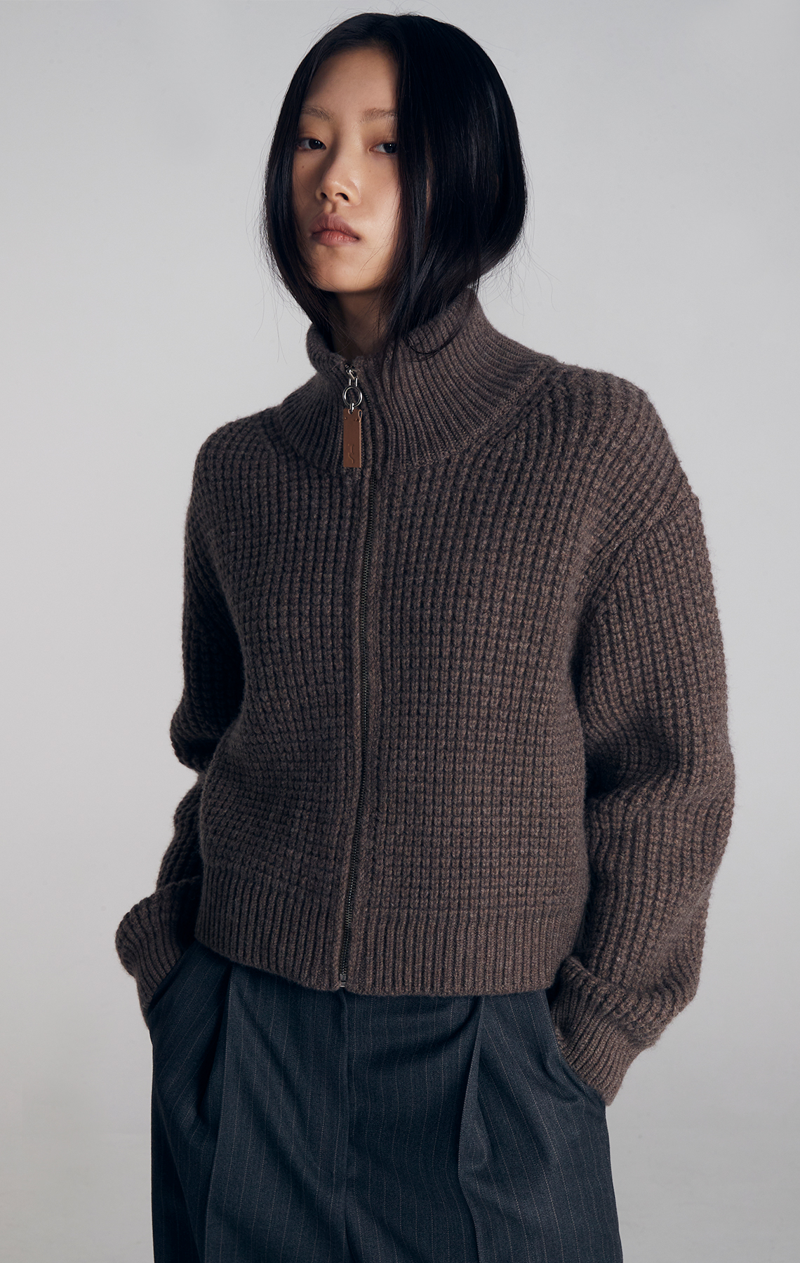 고급 슈퍼파인 메리노 울 소재의 와플 조직 니트 집업입니다.