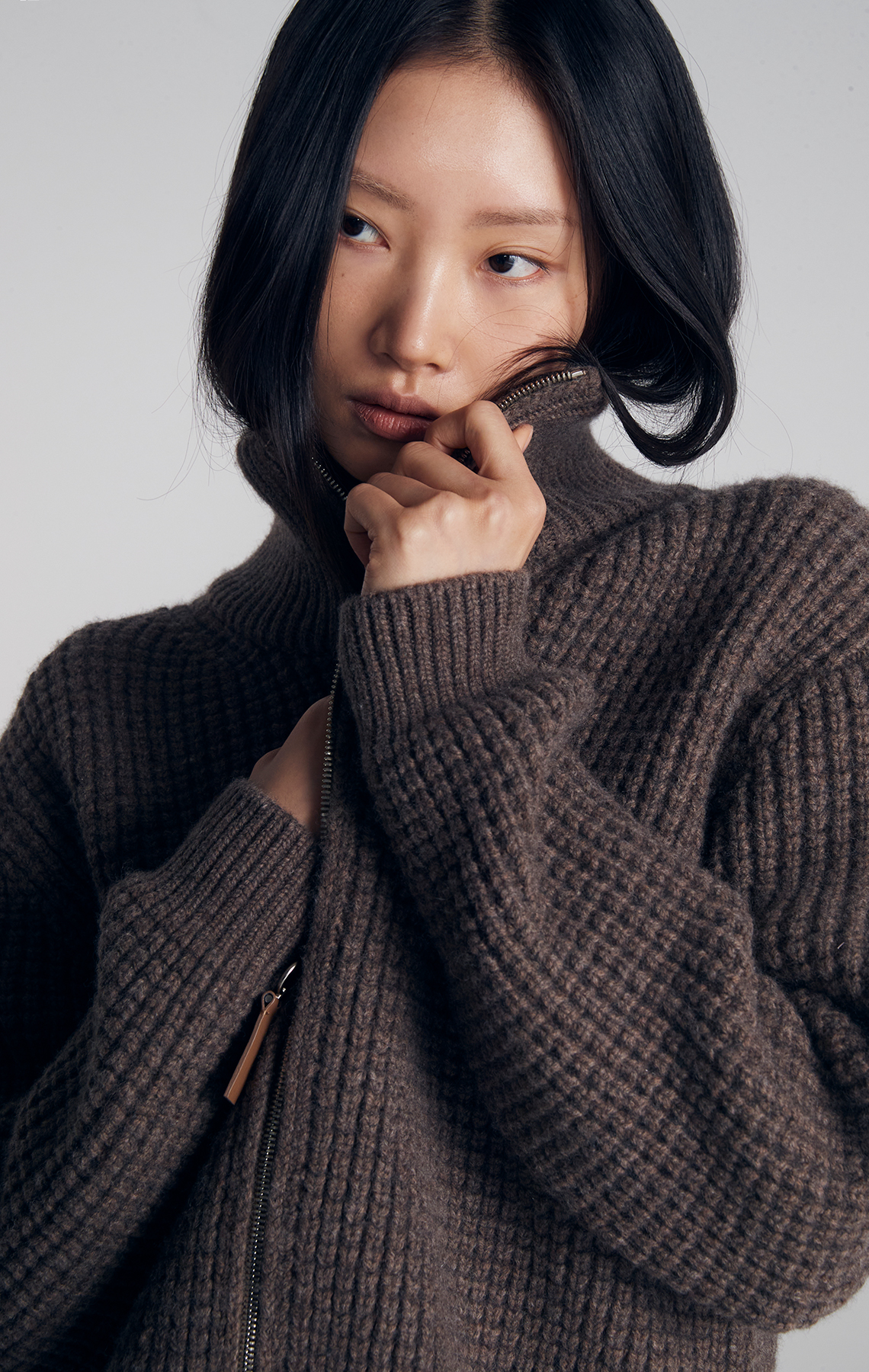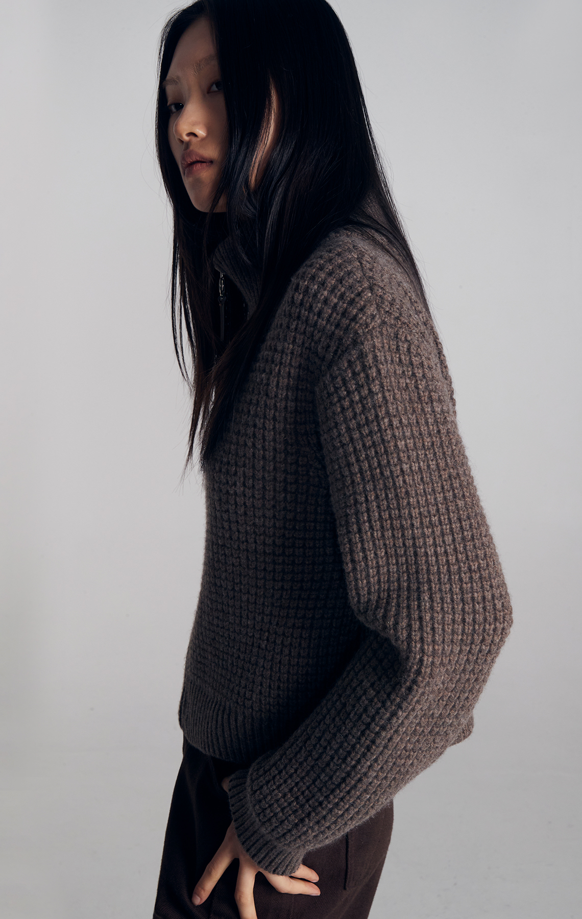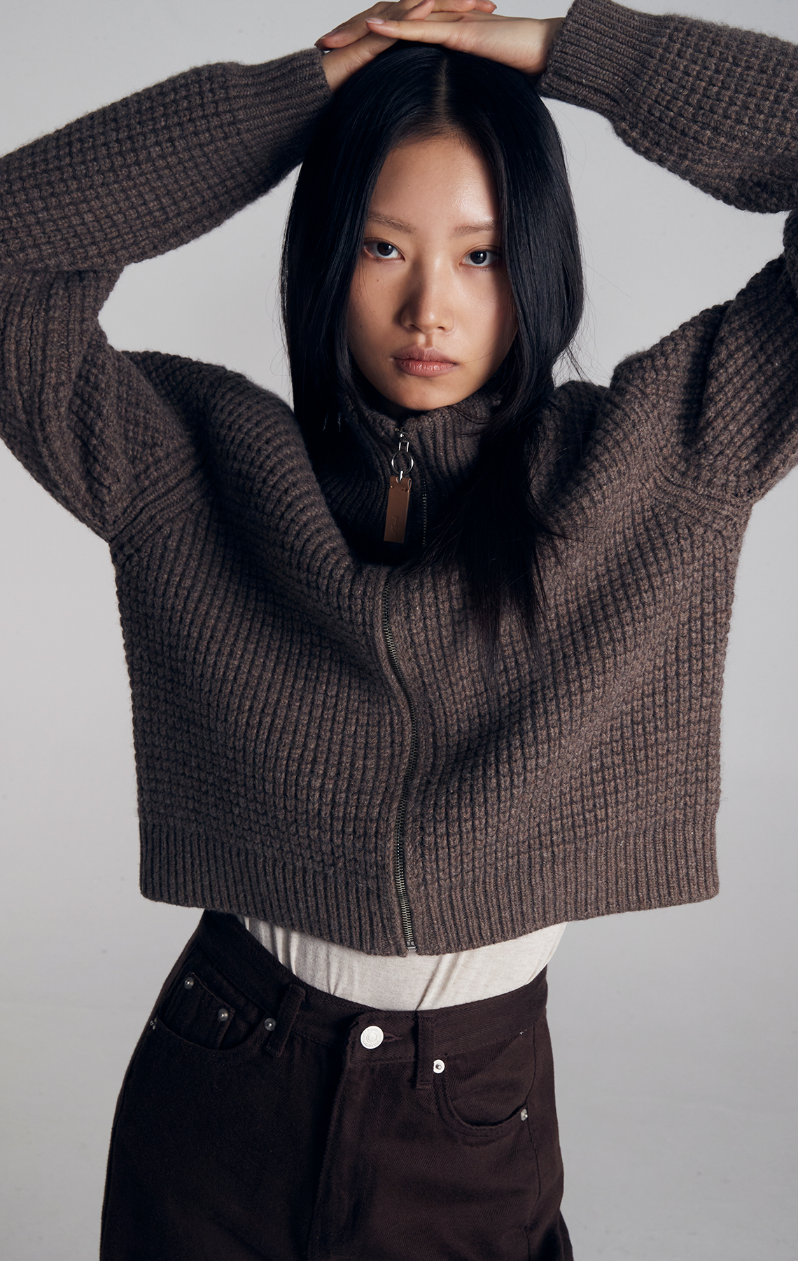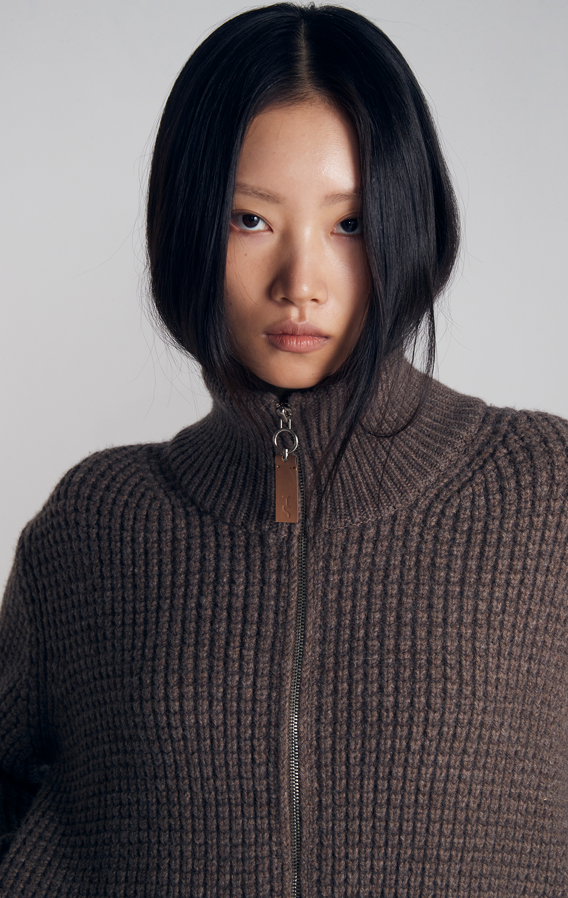 고급 슈퍼파인 메리노 울 소재의 와플 조직 니트 집업입니다.