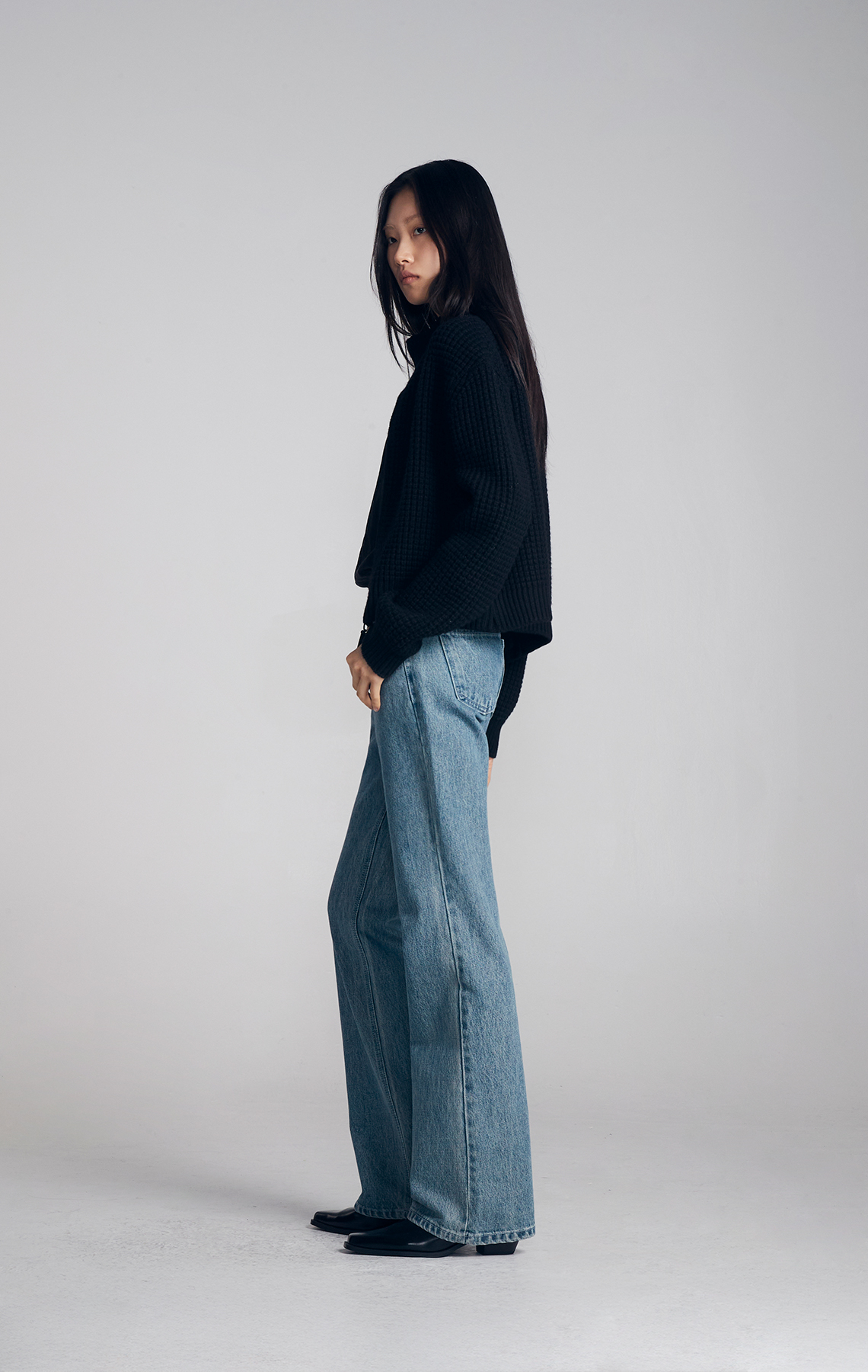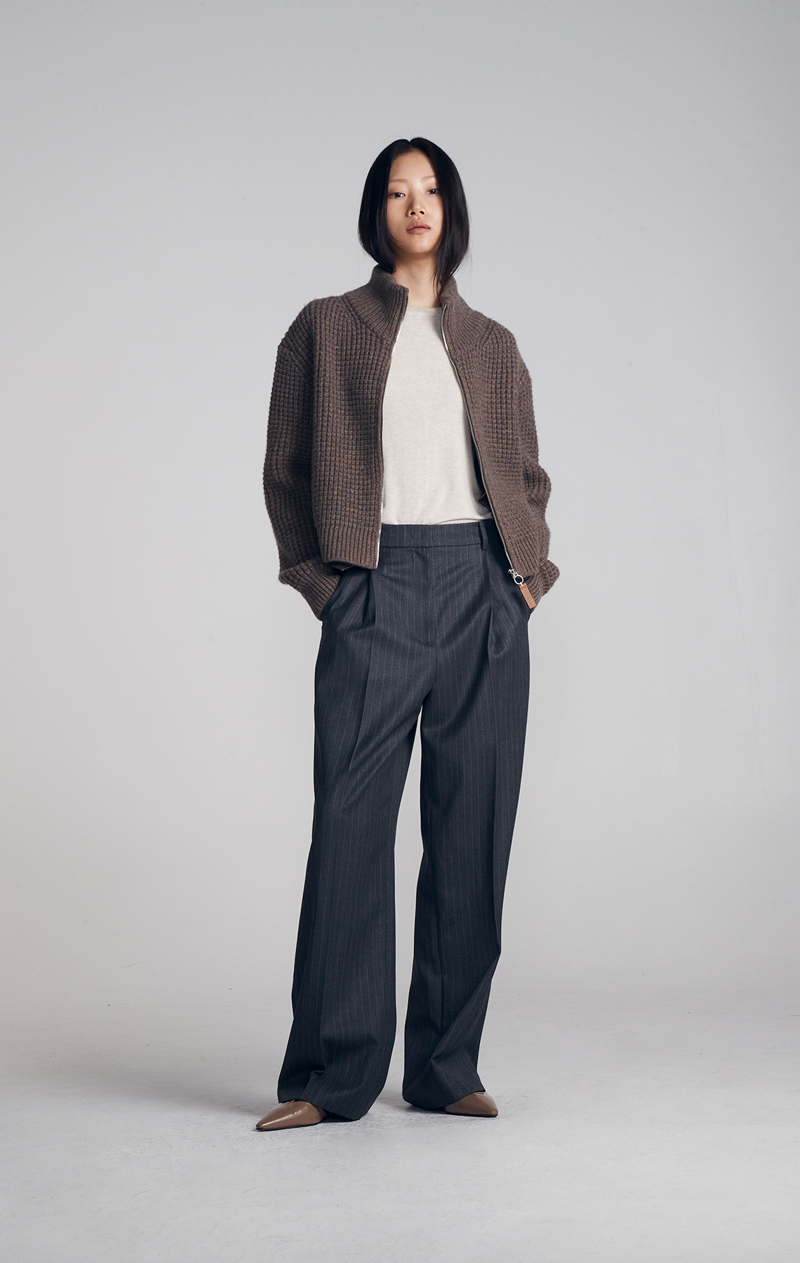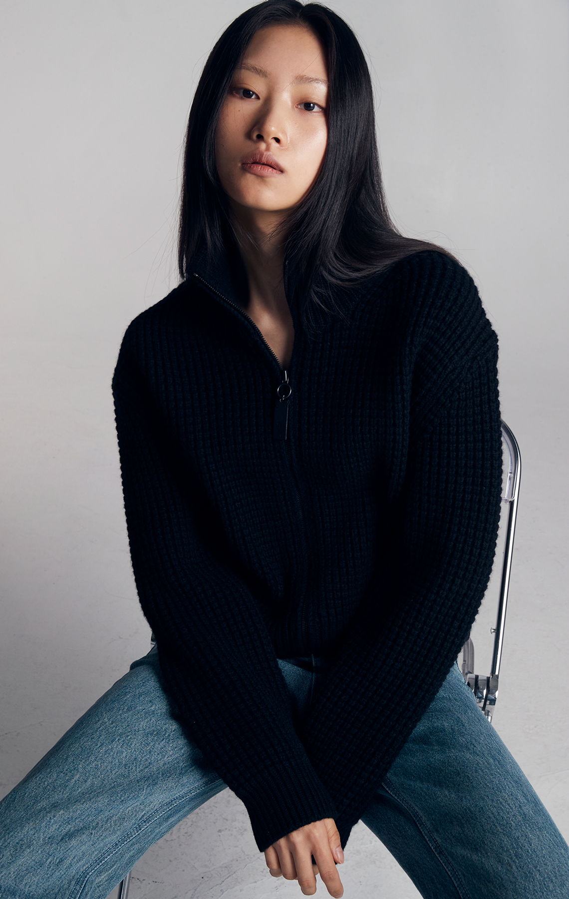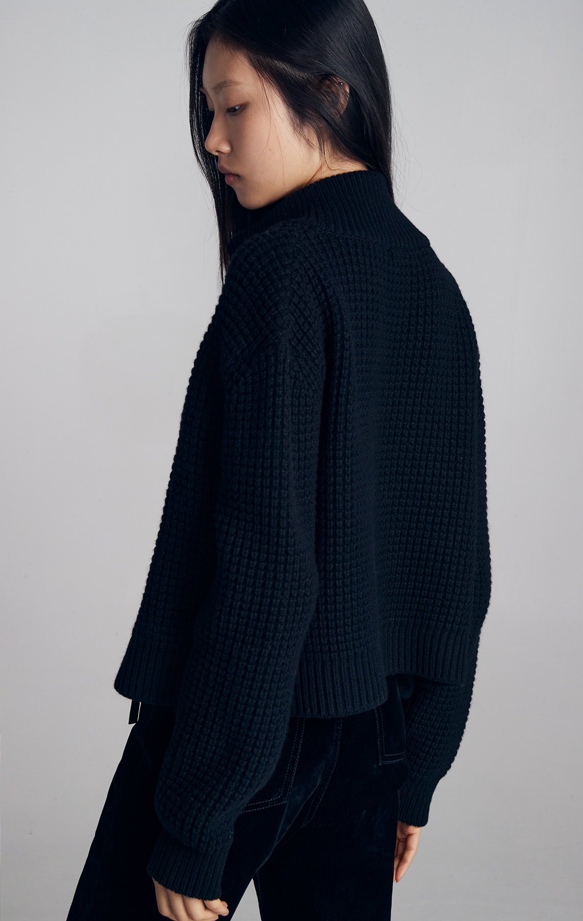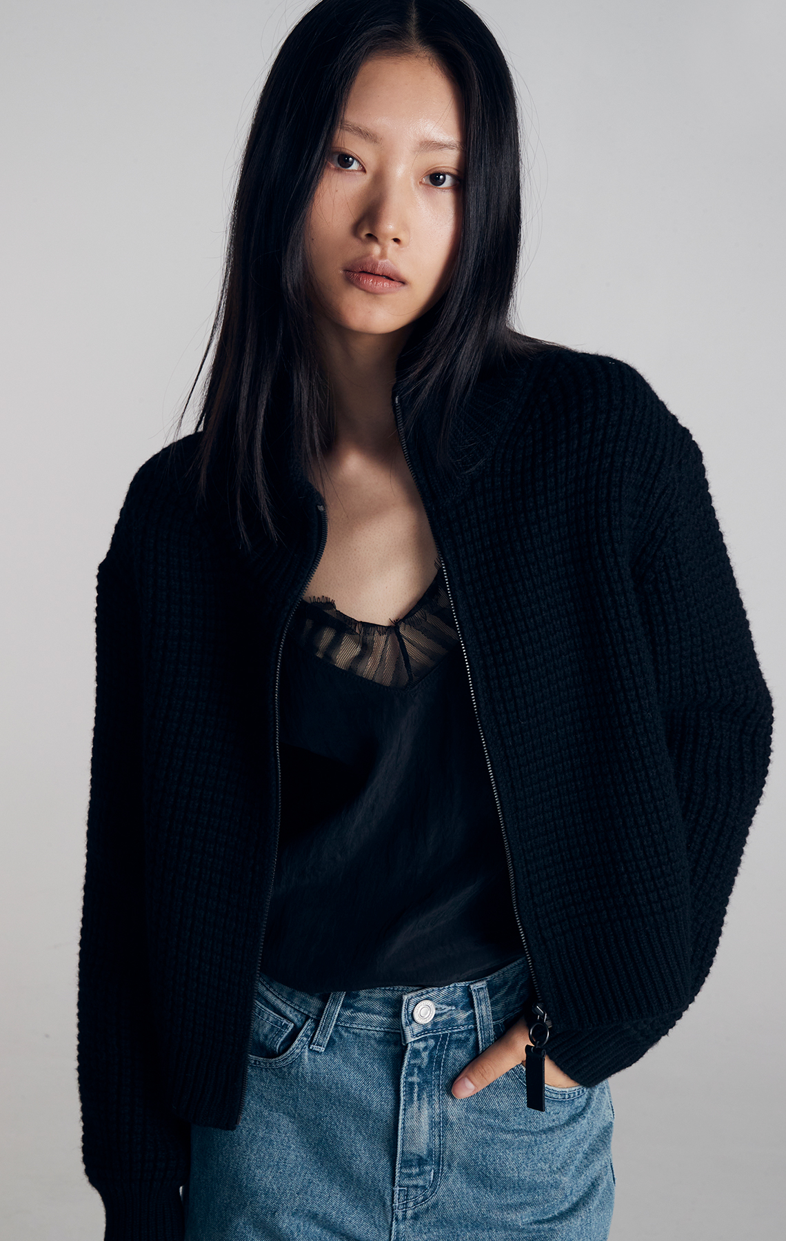 고급 슈퍼파인 메리노 울 소재의 와플 조직 니트 집업입니다.