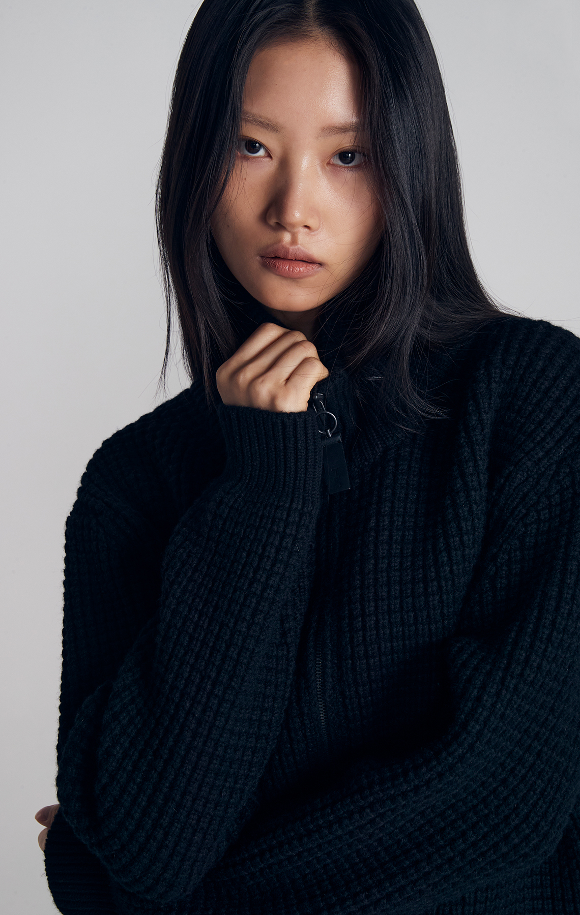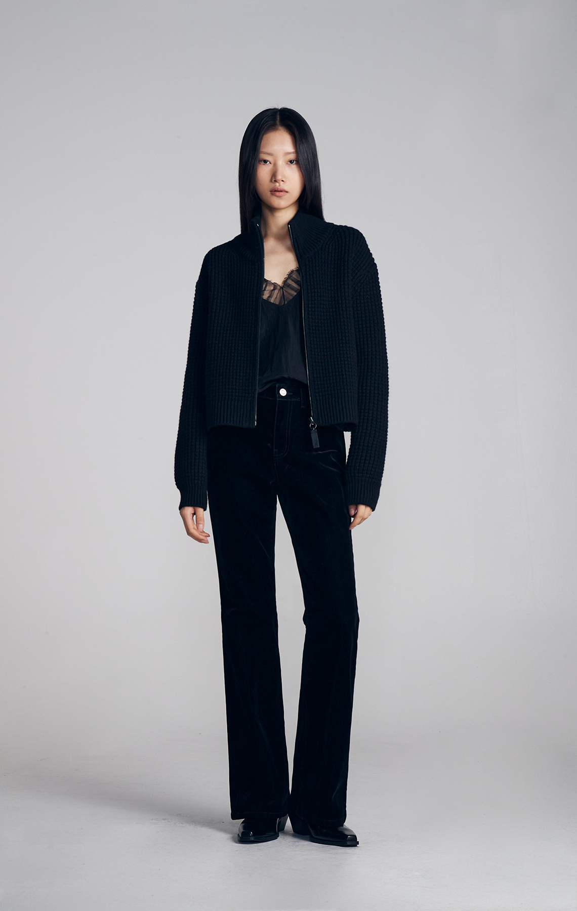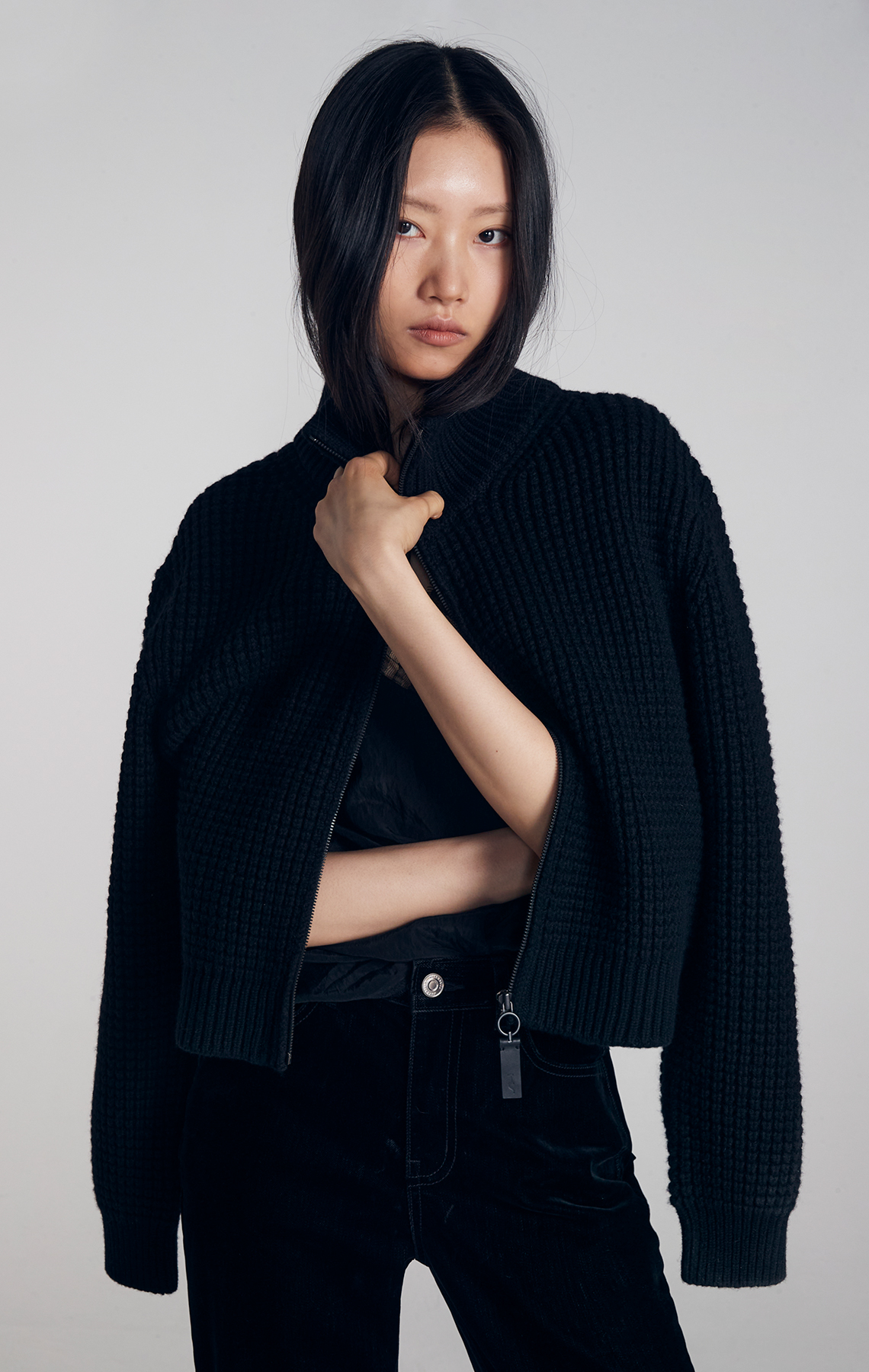 하이넥 디자인과 크롭 기장이 세련된 실루엣을 연출하고,