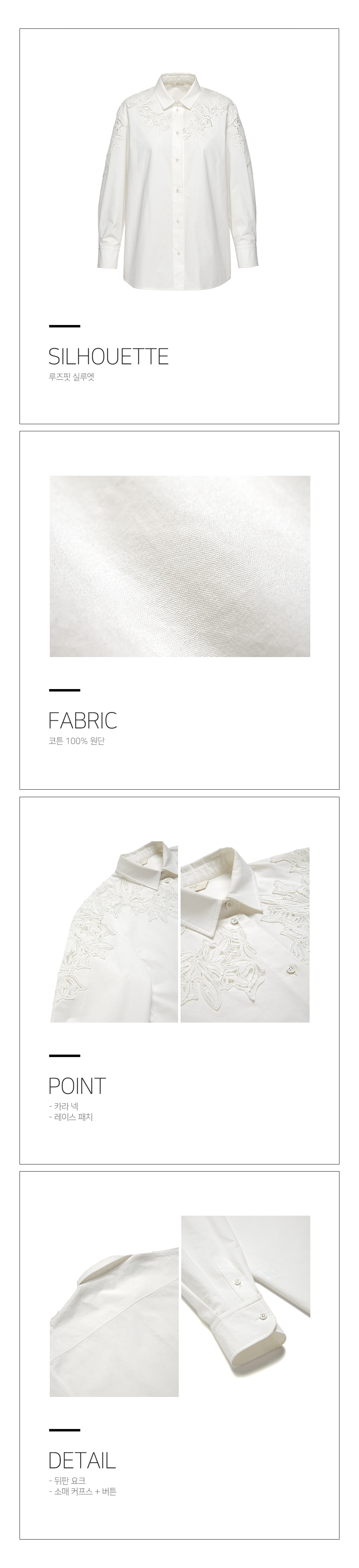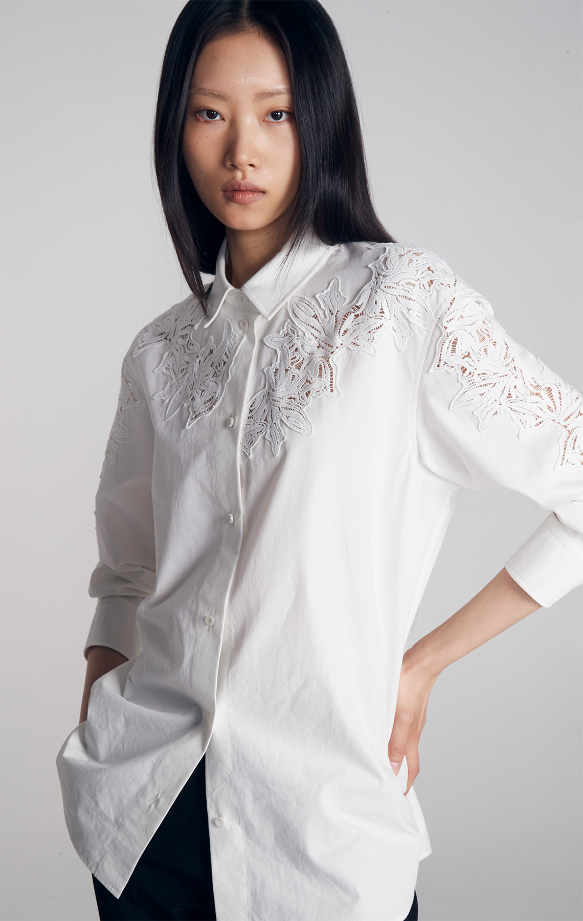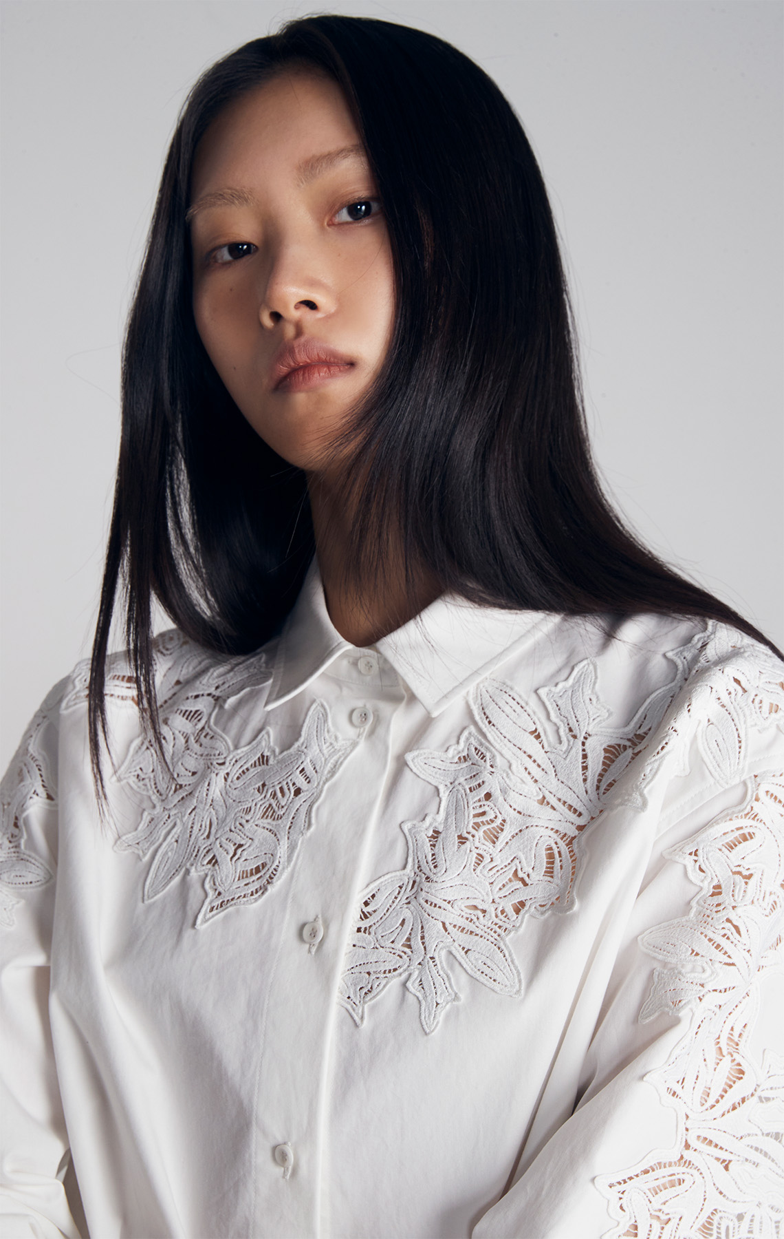 어깨선을 따라 흐르는 레이스 패치는 수작업 자수로 마무리해