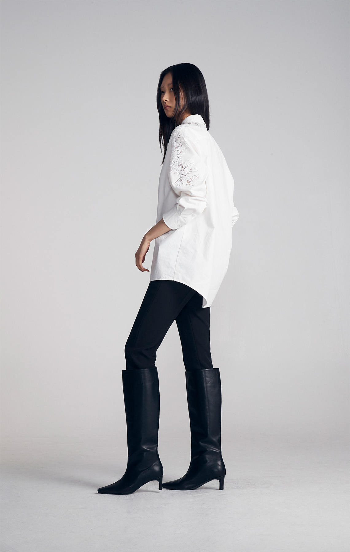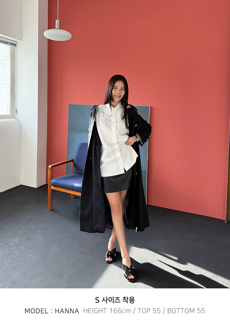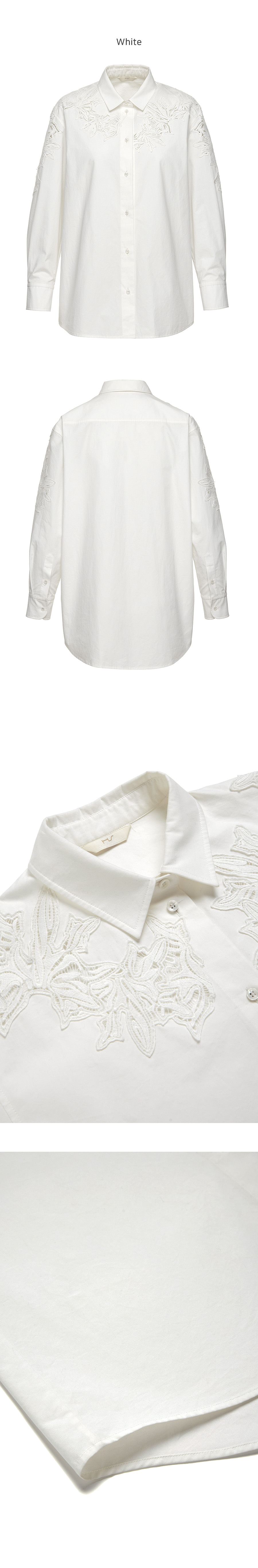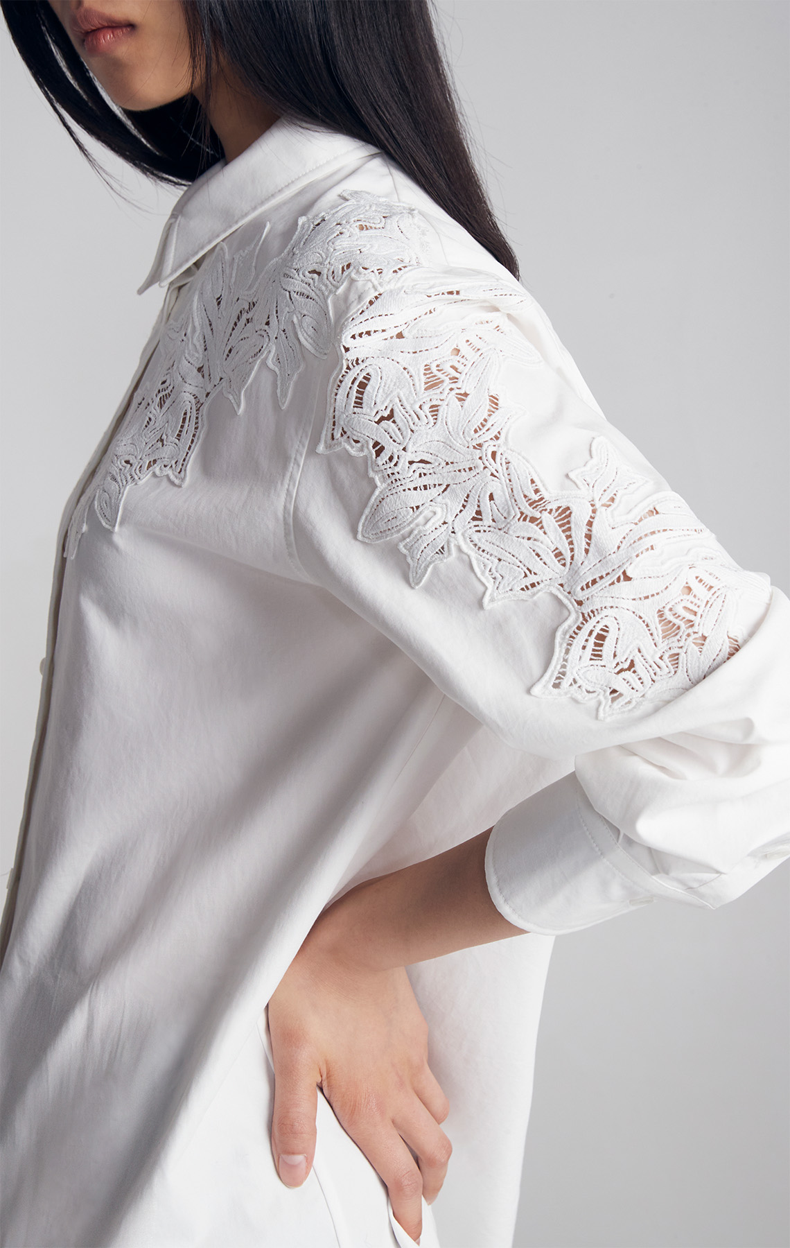 어깨선을 따라 흐르는 레이스 패치는 수작업 자수로 마무리해