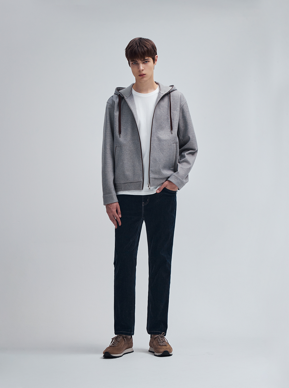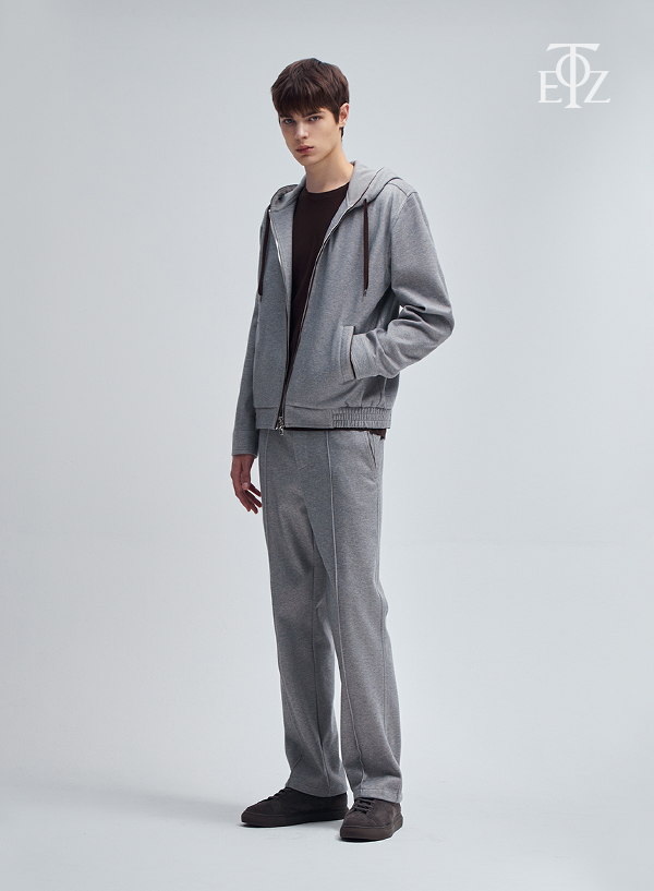 멜란지 트윌 소재의 고급스러운 후드 집업입니다.