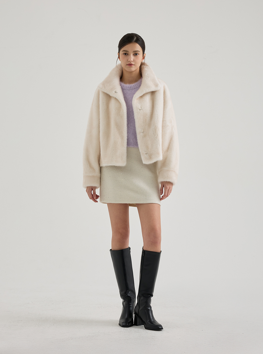 부드럽고 따뜻한 인조 퍼 소재로 제작된 하이넥 자켓입니다.