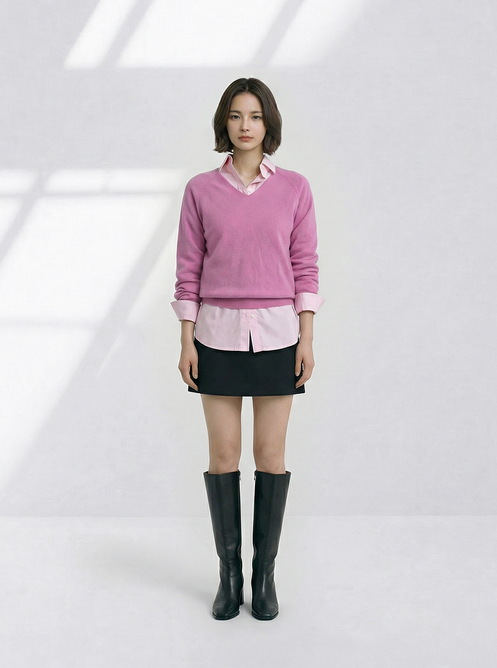브이넥 디자인과 소매 라인의 볼륨감이 여성스러운 실루엣을 강조하며,