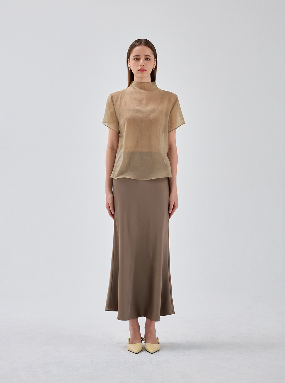 은은하게 비치는 크링클 원단이 돋보이는 블라우스입니다.