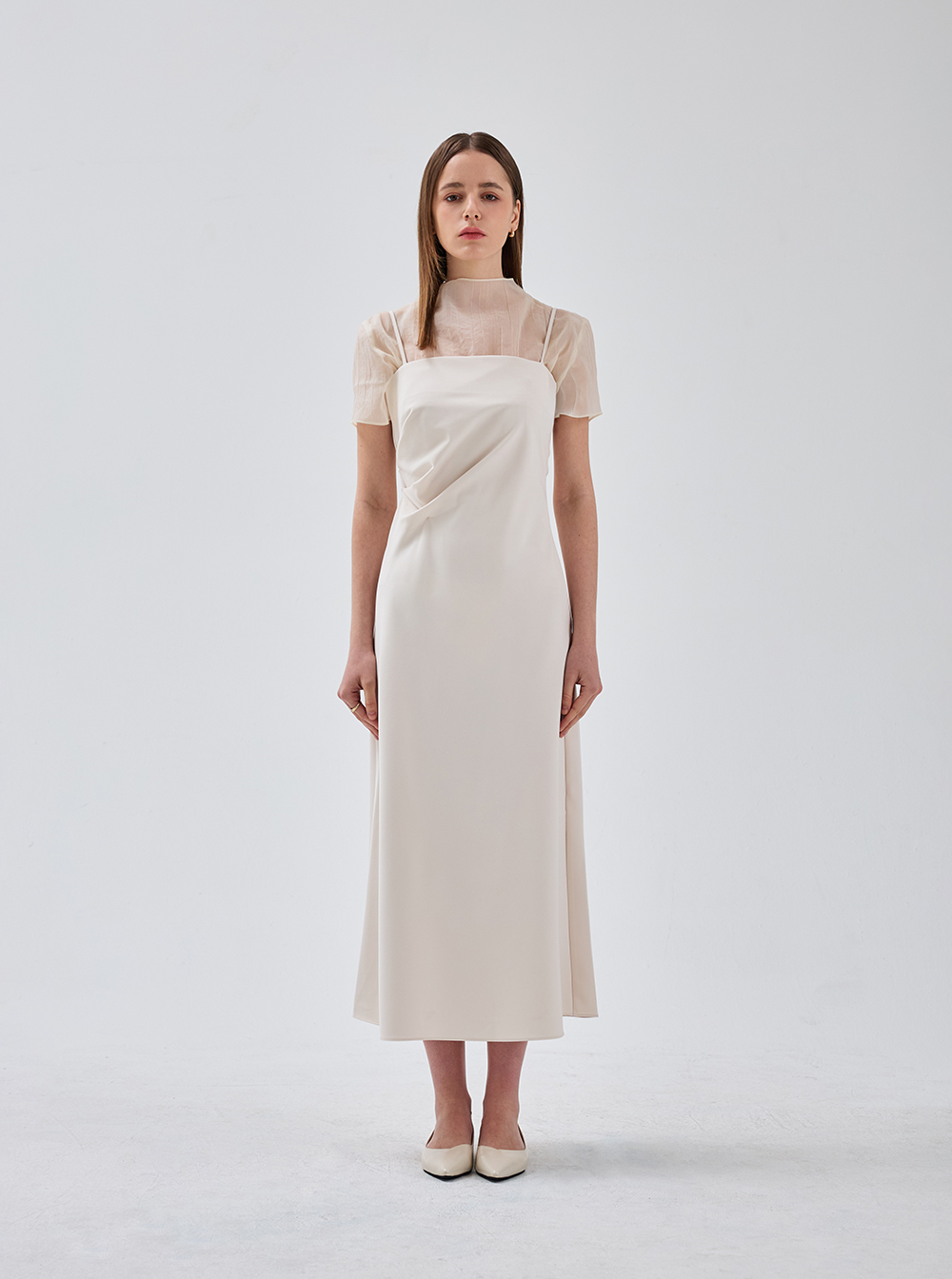 셔링 디테일로 드레이프가 돋보이는 롱 원피스입니다.