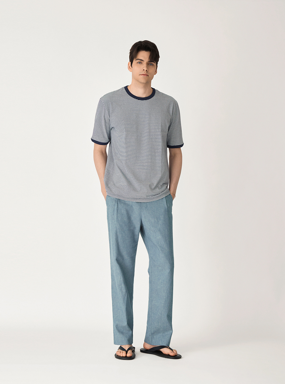 크루넥 디자인에 대비되는 스트라이프 포인트를 더해